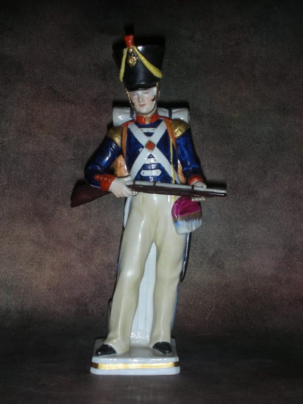 Во время изготовления фарфоровой фигурки пешего или конного воина предметы снаряжения и обмундирования выписывались до мельчайших элементов – но это было лишь одной стороной вопроса. Для изготовления фигурок готовилась специальная фарфоровая масса, так называемый слип. Эта операция выполнялась наиболее опытными квалифицированными рабочими завода. На следующем этапе слип делился на определенные части для каждой фигурки, которые нумеровались в соответствии с моделью, и только после этого начинался сложный процесс формирования из этих частей солдат и всадников.