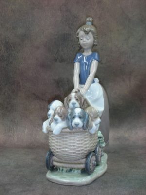 «Девочка с полной коляской щенков», Испания (Lladro), 1990-1999 г., Высота 21 см., длина 15 см.