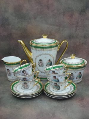 «Кофейный сервиз на 6 персон «Наполеон и Жозефина», Высота Кофейника — 20см., сахарницы 12 см., Молочника — 10 см., Чашки — 5 см., диаметр блюдца — 13 см., Франция.