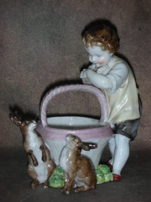 «Мальчик с корзиной и двумя зайцами», Германия, Дрезденский фарфор, 1850-80 гг., Высота 13 см., длина 12 см.