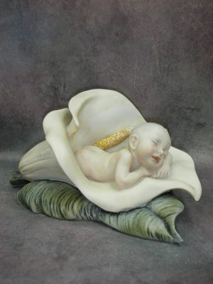 «Младенец в цветке белой каллы», Италия (Capodimonte), Мастер Джузеппе Армани, костяной фарфор, Высота 9 см., длина 17 см.