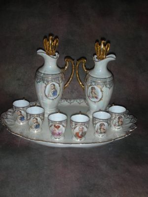 «Набор для крепких напитков», Германия, поднос 31 на 22 см., чашки — высота 4,5 см., кувшин — высота 19 см.