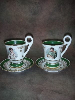 «Наполеон и Жозефина» — чайная пара, Франция (Limoges), Высота 10 см., диаметр чашки 6 см., диаметр блюдца 10,5 см.