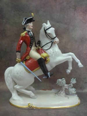 «Офицер Драгунского полка 1775 гг. на коне», Германия (Nymphenburg), Середина XX века, Высота: 28 см. , основание 24 см. на 13 см.