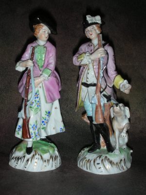 «Охотники с собакой» — пара, Германия, мануфактура «Почаппель» (Potschappel), Карл Тиме (Carl Thieme).Высота 15 см.