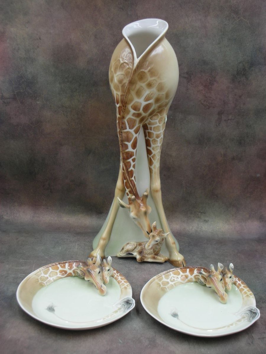 «Жираф с жирафёнком» — ваза и два блюдца, Компания FRANZ Collection, Германия/Китай, Высота вазы 38 см., диаметр блюдца 16 см.